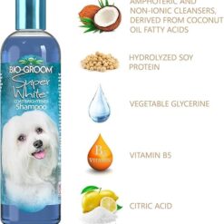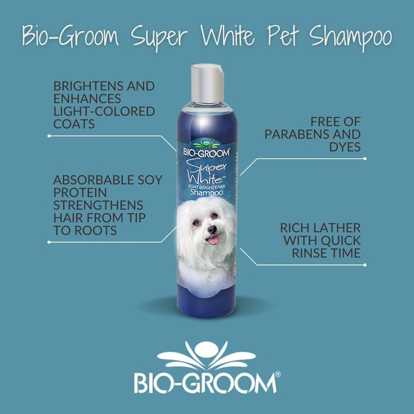Bio-Groom Super White is een verhelderende hondenshampoo die speciaal is ontwikkeld voor witte en lichte vachten. Dankzij de witmakende stoffen en het parelmoer spoelmiddel krijgt de vacht direct meer glans en wordt de kleurintensiteit versterkt. De formule is mild, pH-neutraal en vrij van irriterende stoffen, waardoor hij geschikt is voor regelmatig gebruik. De voedende kokosolie en proteïnen beschermen tegen uitdroging, geven volume en maken de vacht soepel en makkelijk doorkambaar.